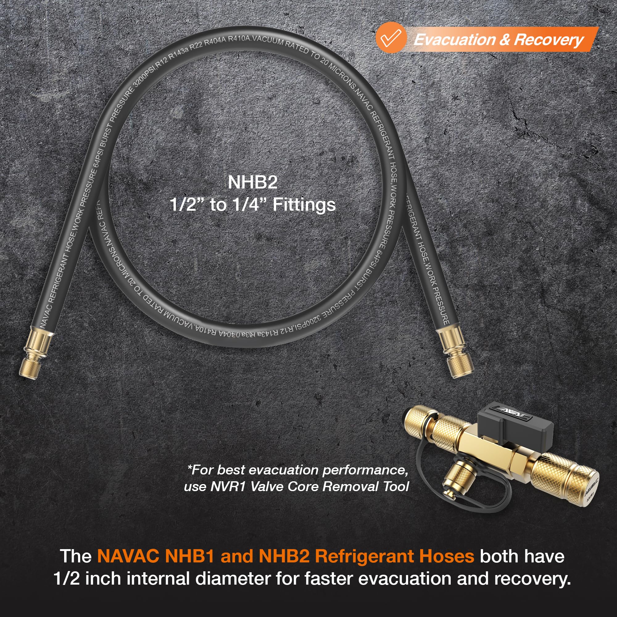 NAVAC NHB2 High-Flow Refrigerant Hose – 1/2″ to 1/4″ Fittings – 6 Feet Length – 1/2″ Internal Diameter – Faster HVAC Evacuation and Recovery – 20 Microns Vacuum – 1 Year Warranty