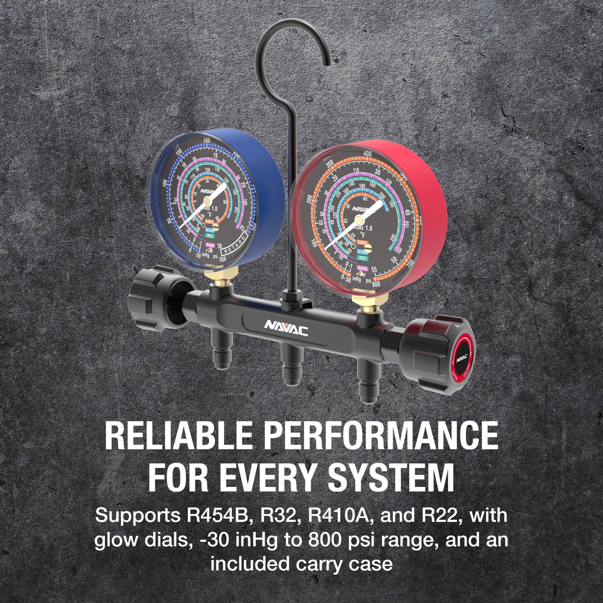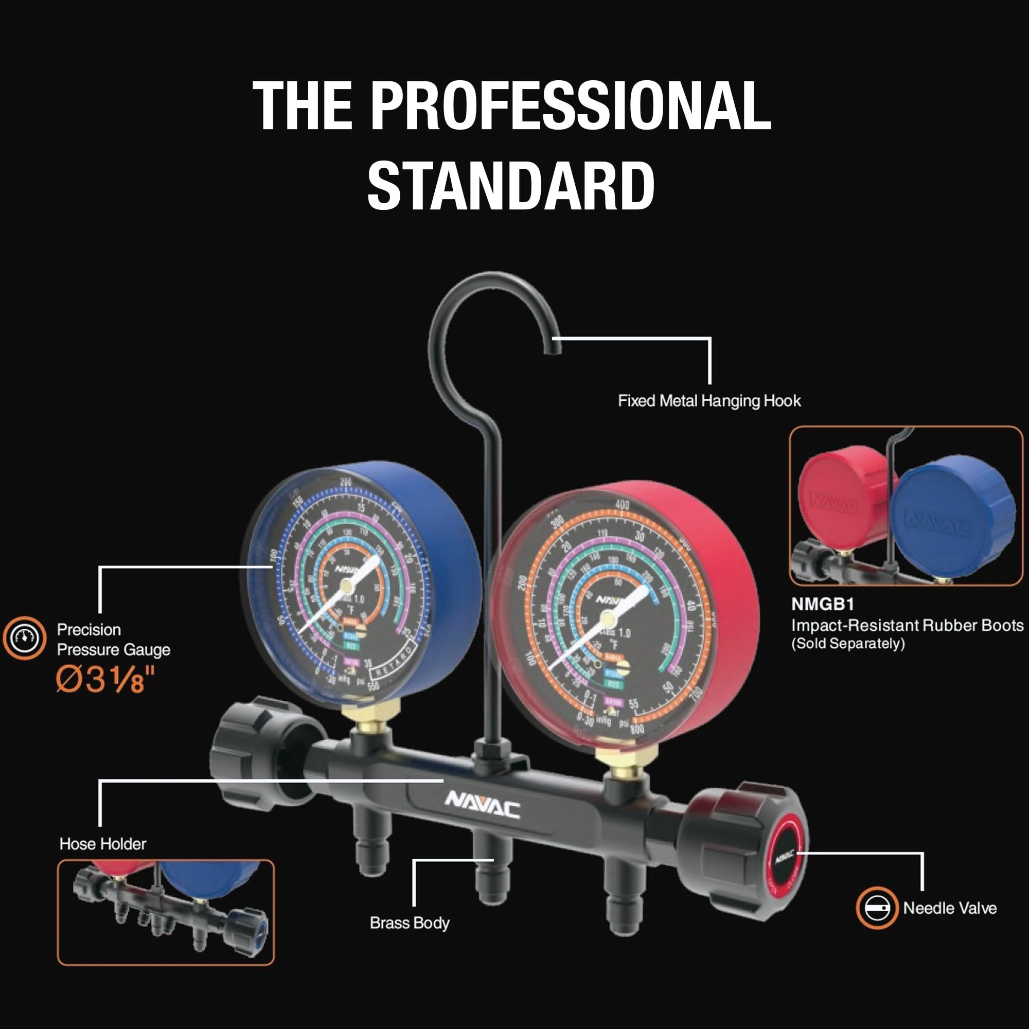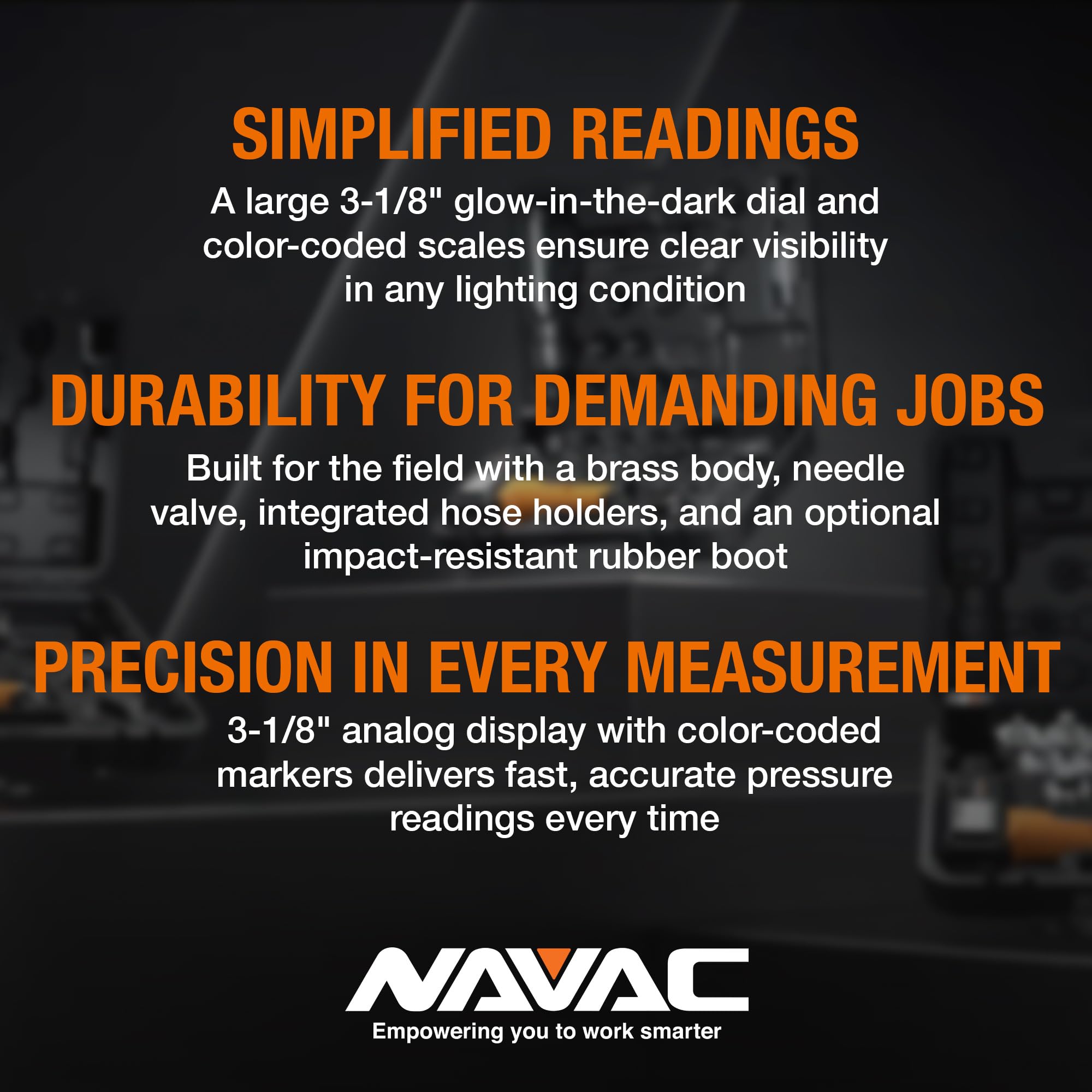 NAVAC NMG12A Pro Manifold Gauge – Brass Body with Needle Valve, Precision Dial, A2L Compatible, HVAC Manifold Gauge with Glow-in-The-Dark Elements, Hose Holders & Hanging Hook, Pro Series