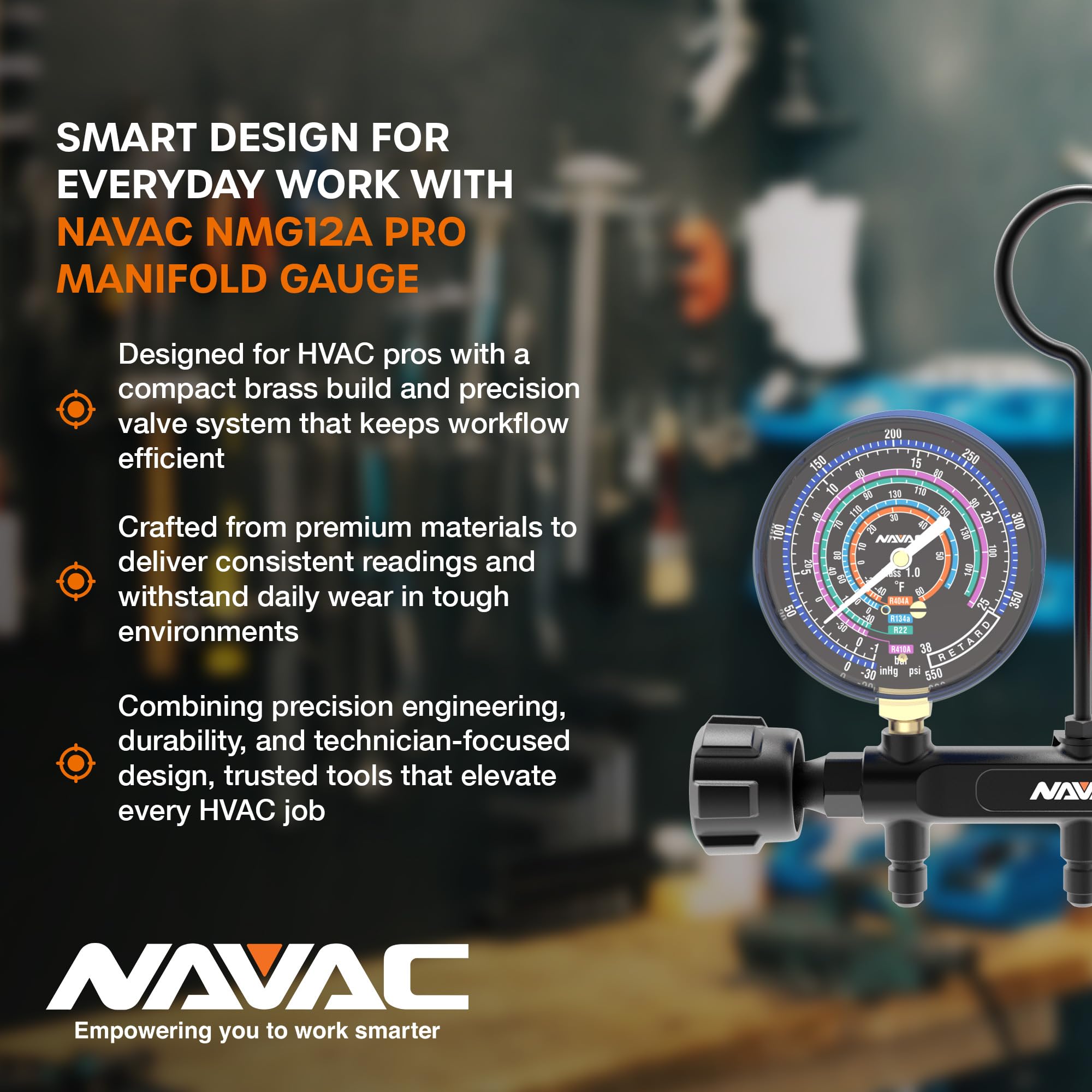 NAVAC NMG12A Pro Manifold Gauge – Brass Body with Needle Valve, Precision Dial, A2L Compatible, HVAC Manifold Gauge with Glow-in-The-Dark Elements, Hose Holders & Hanging Hook, Pro Series is designed for efficient HVAC service and dependable hose performance. It is made to support reliable refrigerant transfer and reduce service delays. The rugged build supports daily field use where leak resistance and durability matter.