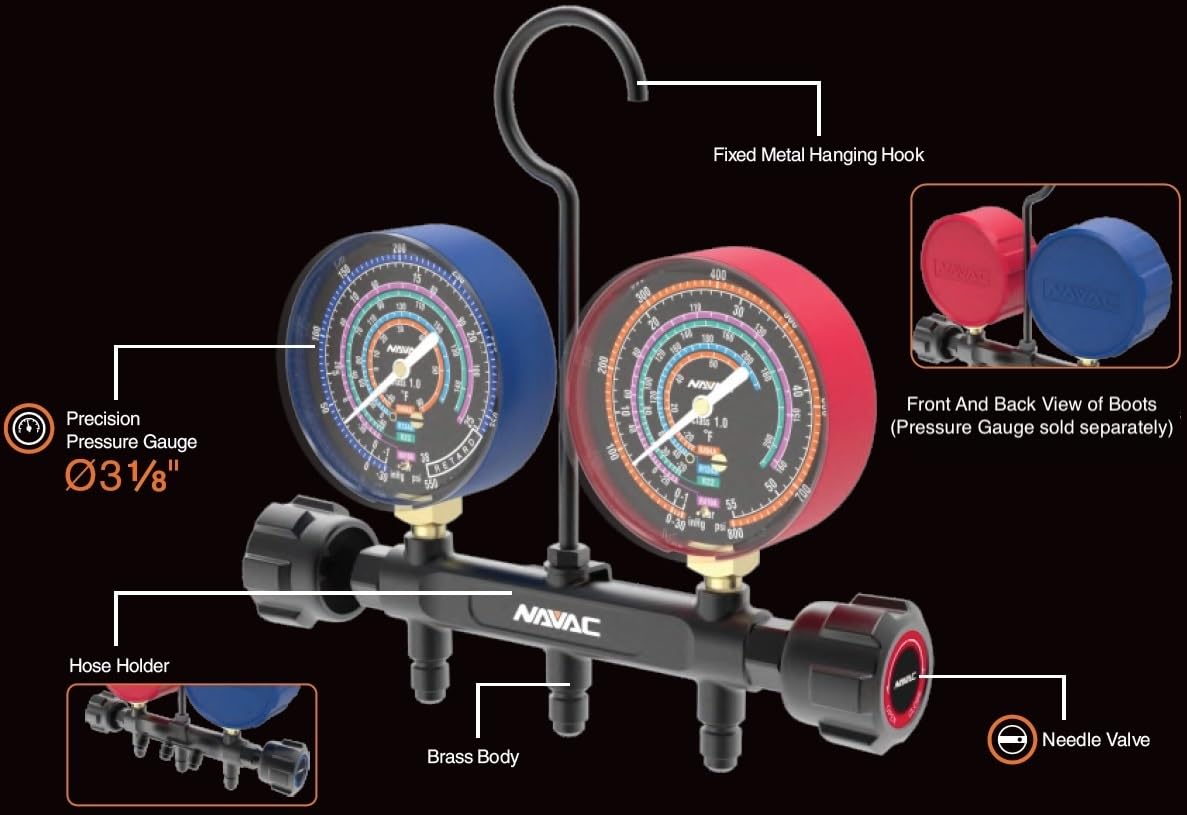 NAVAC NMGB1 Impact-Resistant Refrigerant Pressure Gauge Boots | Protective Rubber Covers Pro Manifold Gauges NMG11A, NMG12A, NMG13A, NMG14A, NMG15A | Fits 3-1/8″ Diameter | 1 Red, 1 Blue is built for accurate HVAC diagnostics and dependable field use. Its durable construction and clear readout help technicians check pressure and vacuum performance quickly on busy service calls.